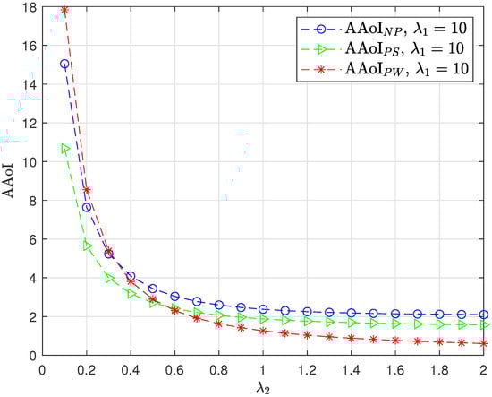 Based on the above derivation, Figure 6 briefly compares the average AoI performance under the three queuing disciplines, for . From the figure, it is evident that as parameter increases towards , , , and decrease. The AAoI initially decreases significantly as the update rate increases from zero, and the AoI reduction diminishes as the continues to increase. Specifically, as increases, becomes lower compared to and , signifying better AoI performance from the LCFS-PW. In the next section, the -related performance is simulated and analyzed in the satellite and UAV synergy remote sensing scenario.