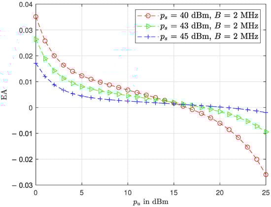 In Figure 8, EA > 0 indicates that under the current settings of and , the FFR strategy outperforms FDMA in per unit transmit power. This indicates that under these settings, the FFR strategy exhibits superior energy efficiency compared to FDMA. It verifies that FFR can be a preferable strategy in scenarios where energy resources are constrained, such as in battery-operated UAVs or power-limited satellites. As increases, more energy is consumed, leading to a decrease in EA. This is due to the fact that it is inefficient to reduce the AoI by increasing the rate of only one Poisson process. However, when more is spent, EA is still above 0, especially when < 15 dBm. This is mainly due to two reasons. On the one hand, the FFR strategy can improve the spectrum efficiency and network throughput in SAGIN, which improves the AoI performance. On the other hand, appropriately increasing can improve the SINR of the SAT-GU channel, which mitigates the effects of interference from the UAV-GU channel to the SAT-GU channel and then enhances the resistance of the satellite signal. This improves the communication rate of the SAT-UAV channel and, to some extent, improves the AoI performance of the fused information at GU under the FFR strategy. This insight suggests that power control strategies should be an integral part of network design. In practice, the AoI of fused remote sensing information in the SAGIN network can be improved by deploying the power control mechanism to adjust the satellite power output according to the real-time interference level. Additionally, as increases, the interference from the UAV-GU channel to the SAT-GU channel increases, thereby reducing EA. For example, as shown by the blue line in Figure 8, when = 45 dBm and > 21 dBm, EA becomes less than 0. The reduced EA at high highlights the significance of interference management in SAGIN. Techniques such as interference cancellation, beamforming, and advanced modulation schemes could be employed to reduce the impact interference, thereby further improving the AoI performance of fused information in SAGIN.