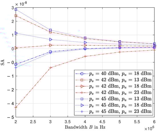 Figure 9 studies the impact of bandwidth B on the spectrum advantage SA, for dBm, dBm, and MHz. When both dBm and dBm, SA > 0, which indicates that the FFR strategy outperforms FDMA in per unit spectrum resource. Under the FFR strategy, interference from the UAV-GU channel to the SAT-GU channel can be mitigated by setting and appropriately to fully utilize spectrum resources and improve system throughput. This, in turn, increases the status information update rate and improves the and SA. The above analysis informs that in spectrum-constrained scenarios such as rural areas lacking infrastructure, the FFR strategy allows for better utilization of available spectrum, leading to improved system throughput and AoI performance. Moreover, SA gradually decreases with the increase in B. This trend suggests that the advantage of FFR in terms of spectrum efficiency diminishes when the spectrum resource is sufficient. It further informs that FFR is beneficial in scenarios with constrained spectrum. On the other hand, when > 18 dBm or < 42 dBm, SA < 0. Under the FFR strategy, either small or large leads to significant interference from UAV-GU channel to SAT-GU channel, which deteriorates the system throughput and SA. Although increasing B improves SA, the benefit is not significant. This is obviously because more spectrum resources have to be allocated. The insights observed from above analysis of SA can provide a reference for spectrum management strategies in SAGIN. For example, in SAGIN, dynamic adjustment of spectrum allocation based on the current power settings and interference levels can optimize network performance. In practice, this could mean deploying cognitive radio techniques that allow the network to dynamically sense and adapt to varying interference, thereby optimizing spectrum efficiency and improving network performance such as AoI.