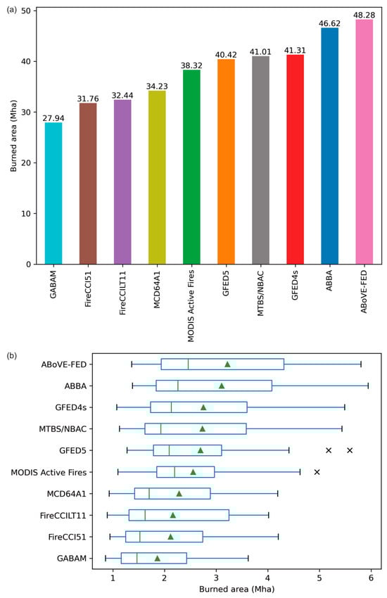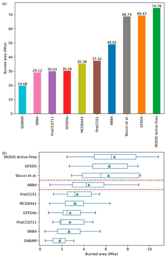 Total BA (a) and box and whisker plot (b) for each dataset for the analysis period (2006–2016) in central/northern Siberia. The whiskers extend to 1.5 * Inter-Quartile Range. The mean of each dataset is given as the green triangle. “Talucci et al.” refers to the Talucci et al. (2022) fire perimeter product [63].