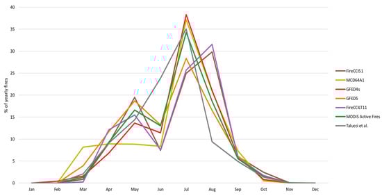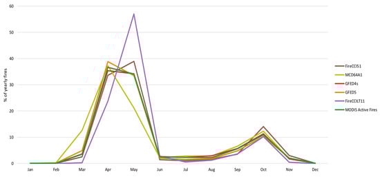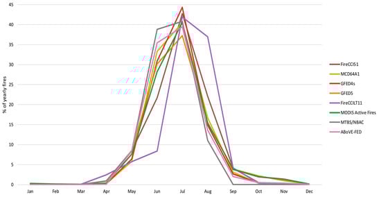 For FireCCI51, the proportions of June/August fires are decreased/increased, respectively, with an almost identical percentage, ca. 22%, of BA occurring in both early and late summer. The FireCCILT11 dataset agrees that most BA in this region is produced in July (42%). However, the seasonal pattern otherwise differs significantly from the other datasets. FireCCILT11 shows that BA constantly increases by 2.5–3% per month from March to June, before jumping to the July peak, a small drop to August (37%), followed by a second, steeper drop down to 4% in September, suggesting that BA is produced toward the end of summer rather than the start.