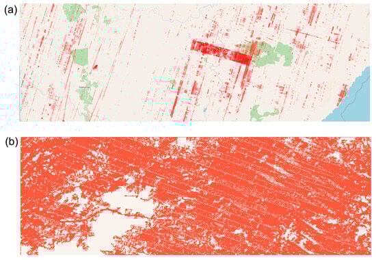 Additionally, we also found significant issues with GABAM during the years 2001–2013. Pixels are often incorrectly identified as burned in the form of additional “stripes” and/or “boxes” (Figure 5a), or scan lines appear as missing patches through burned areas (Figure 5b). The stripes are a result of Landsat-7 ETM+ scan lines being mistaken as burnt patches, increasing commission errors [122]. The Landsat-7 ETM+ Scan Line Corrector (SLC) failed permanently on 31 May 2003, causing all subsequent images to miss ca. 22% of the normal scene area [123]. However, we found that boxes can occur if the GABAM processing algorithm fails at the point of overlap between two or more Landsat-7 ETM+ images. While we found that although these issues can occur all over the world, they are most prevalent in Siberia.
