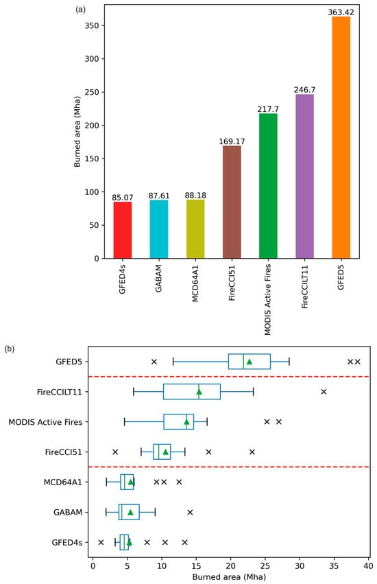 The total BA in GFED5 was computed using a variation of this process: in the dataset each pixel was given the value of the BA in square kilometers (km2), so the sum reducer was applied before being converted to Mha.