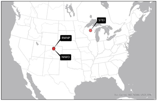 Figure 1). The primary subjects of experimentation were the Niwot Ridge (NIWO) and Rocky Mountain National Park (RMNP) sites. The other site, Steigerwaldt–Chequamegon (STEI), is the source of unlabeled data for a semi-supervised model.