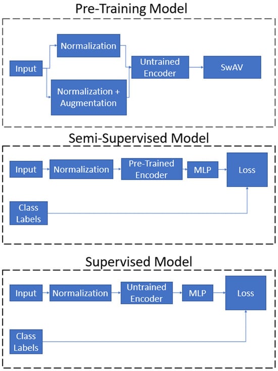 We used the same architectural parameters across both styles of deep-learning models. This allowed us to easily swap a pre-trained encoder into the supervised architecture, creating the semi-supervised architecture. For all deep-learning models testing PCA inputs, we used an embedding size of 128; a sequence length of 16, meaning that the model can address 16 pixels at a time, a feature length of 16; 12 encoding layers; a dropout rate of 0.2; and 4 attention heads. When performing supervised learning, the learning rate for all models was 5 × 10−4. When performing pre-training, the learning rate used was 5 × 10−5, as we found that a higher learning rate did not lead to stable results. The classification decoder is a 2-layer multilayer perception, with the number of parameters depending on the output classes. Loss, used to update model weights, was calculated using the binary cross-entropy loss function. No fine-tuning of model hyperparameters was performed. All deep-learning models were trained using a 60% training/20% validation/20% testing data split, with the validation data reserved to ensure our models had not overfit. All data were normalized to have unit mean and standard deviation before being fed to our deep-learning models.