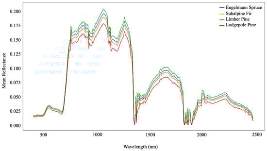 9], it became evident during this research that certain hyperspectral bands exhibited higher levels of noise compared to others. Notably, bands that are highly absorbed by water molecules, as well as those situated at the extremes of the wavelength spectrum, tended to display noticeable noise or contained significantly lower values relative to the remaining bands. To account for this, we examined spectrographs from pixels throughout the NIWO study site and determined a range of bands to be included. The bands included fell between 410 and 1320 nm, 1450 and 1800 nm, and 2050 to 2475 nm.
