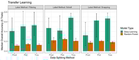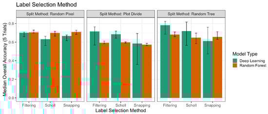 Deep learning outperformed random forest classification across almost all combinations of experimental parameters outside of using the random pixel data-splitting method. However, we also notice the large error bars in the deep-learning results. While we do not believe these significantly impact our conclusions thus far, they provide valuable insight for future model development and training techniques.