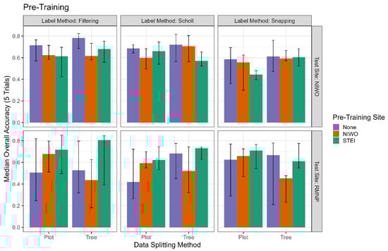 Figure 10), the filtering method underperformed. The filtering method requires two parameters, namely the acceptable range of standard deviations from the mean height difference between ground observations and the canopy-height model and the acceptable minimum standard deviation from the mean regarding the lateral distance between trees. For these experiments, we found these parameters (±1.5 standard deviations for height difference, ≥1.5 standard deviation for lateral distance) based on visual observations of the data from the NIWO site. We may get better results by tuning these parameters per site by using the filtering method. It should also be noted that the filtering method performed best at the pre-training inter-site classification task, indicating, again, that the data-labeling selection method is not the controlling factor in model accuracy.