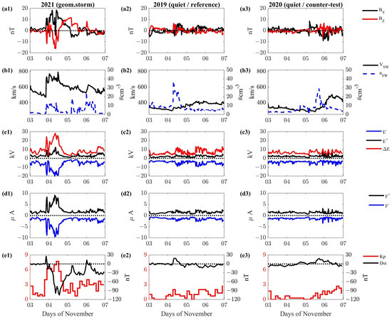 (From top to bottom) The interplanetary parameter conditions , (panels a1–a3), and (panels b1–b3), used by the W05 model; the hemispheric average in the northern hemisphere of polar cap potential E (panels c1–c3) and FACs intensities F (panels d1–d3) for both positive (black curves) and negative (blue curves) components, as well as the (red curves). The same quantities for the southern hemisphere are very similar to those shown here and are not reported for simplicity; the geomagnetic activity indices (panels e1–e3) Dst (black curves) and Kp (red segments) during 3–6 November for the three years 2019, 2020 and 2021.