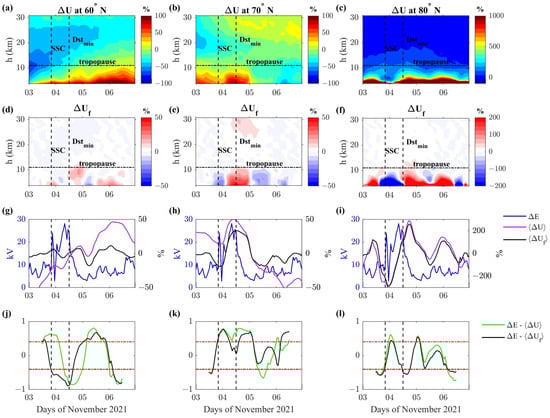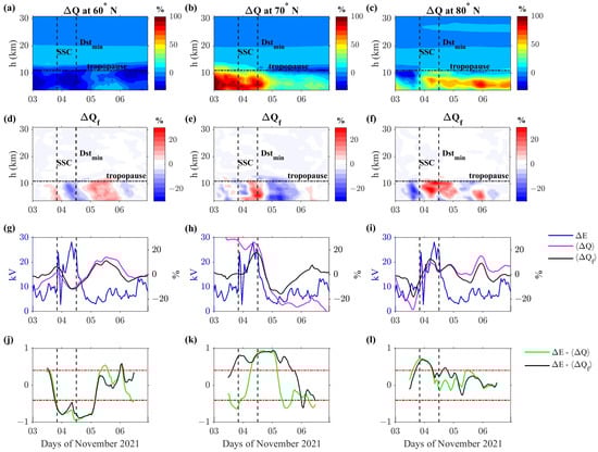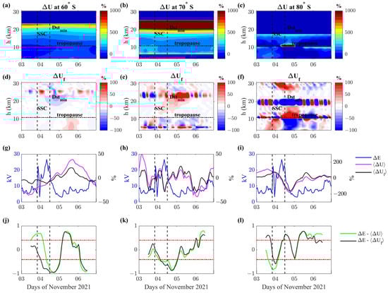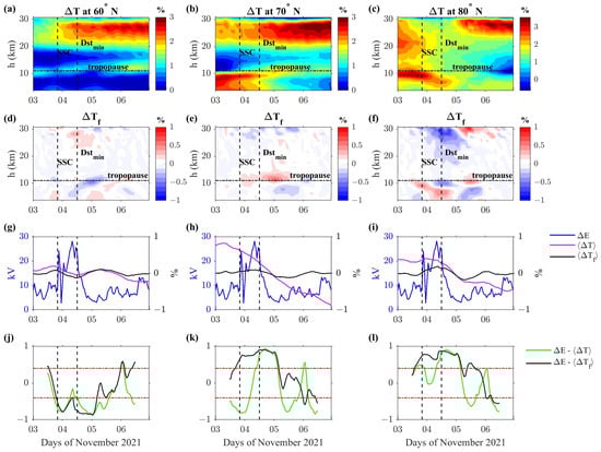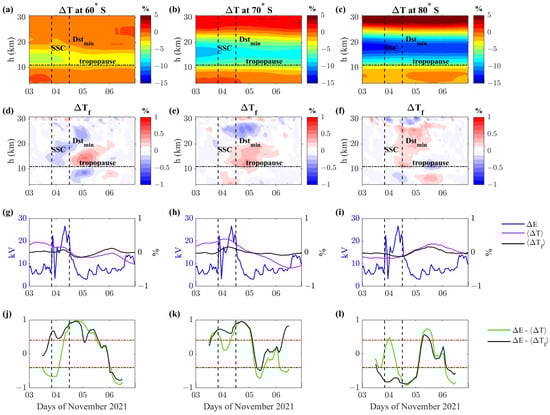Figure 2a–c show the relative deviation in temperature during the disturbed period of November 2021 at three different latitudes 60°, 70°, and 80°N, in the northern hemisphere. From these panels, it is not clear how the temperature may be influenced by the geomagnetic activity, here marked by vertical bars in correspondence of the Storm Sudden Commencement (SSC) and the minimum of the Dst. It is a matter of fact that troposphere and stratosphere systems show important differences in terms of dynamics, vertical temperature gradient and stability, ozone content and chemistry, the abundance of moisture, and the presence of clouds. These differences can significantly impact the correlation between SW and atmospheric parameters at different altitudes.