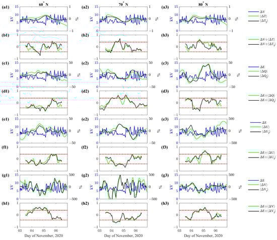 Results of the counter-test analysis conducted for the time interval 3–6 November 2020. Electric field potential difference (blue line) and height average atmospheric parameters (green line) and filtered (black line) at tropospheric heights for T (panels a1–a3), Q (panels c1–c3), U (panels e1–e3), and V (panels g1–g3). The result of moving the correlation analysis among with filtered height average atmospheric parameters (panels b1–b3,d1–d3,f1–f3,h1–h3). Horizontal red lines in panels b,d,f,h represent the 95% confidence interval.