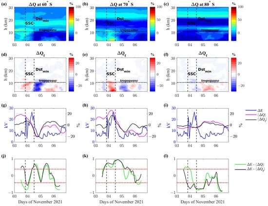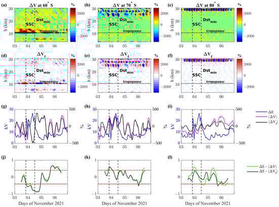 Relative temperature deviation during 3–6 November 2021 (panels a–c) and the time-filtered version (panels d–f) as a function of time and height, for three different geographic latitudes in the southern hemisphere: in these panels, the tropopause is indicated by horizontal lines. Electric field potential difference (blue line in panels g–i) in the southern hemisphere and height average (magenta line) and filtered (black line) atmospheric parameters at tropospheric heights. The result of moving the correlation analysis (panels j–l) among with (green line) and with (black line). The SSC and minimum value of Dst index are reported in all panels as vertical dashed lines; the tropospheric altitude range of 3–11 km considered in computing and then is marked by horizontal dashed lines in panels (d–f). Horizontal red lines in panels (j–l) represent the 95% confidence interval.