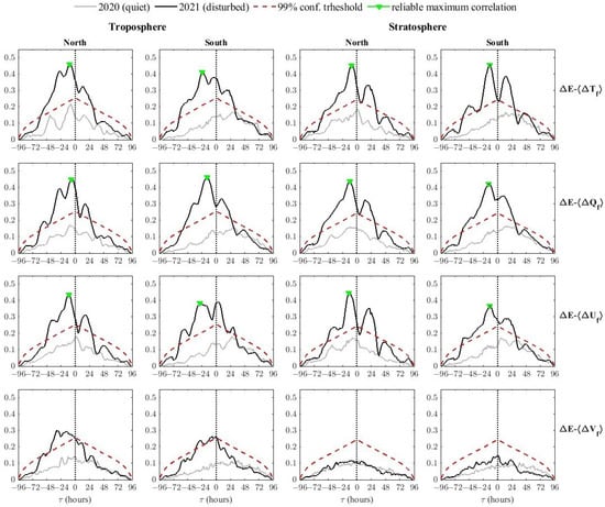 Table 1 summarizes the main results of the cross-covariance analysis by reporting the maximum value of correlation , the corresponding time delay , and the 99% confidence threshold , where is the correlation value that exceeds the corresponding threshold of 20%; please note that with this choice, for example, the correlation peak at the positive lag in (in the southern troposphere) is not considered. For completeness, the entire atmospheric column is analyzed.