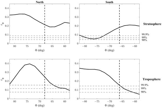 where N represents the actual DoF, i.e., the number of points (,h). We perform a MC test for computing significance levels of R (e.g., [12]). In this regard, the 99% confidence threshold is computed by generating 10,000 uncorrelated pairs of time series and , each one reproducing the corresponding actual spectral slope characterized by red noise. The red noise is realized by considering the actual first-order autoregressive AR(1) process of both time series, obtained from the autocorrelation coefficient at lag = 1. For a complete discussion, see [31]. In the MC test, the value of N depends on the strata investigated: by considering the whole atmospheric strata, N is equal to 630 (21 latitudes and 30 levels), independently of the hemisphere and time delay. To better investigate the effects at tropospheric ( km) and stratospheric ( km) heights, different DoFs are considered: 168 and 462 points for troposphere and stratosphere, respectively.