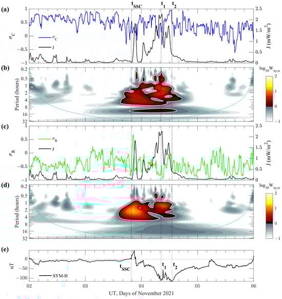 Comparison between and J (panel a) and between and J (panel c) during 2–5 November 2021. Logarithmic of normalized absolute value cross-wavelet spectrum (, color scales) computed between and J (panel b) and between and J (panel d). The 95% significance thresholds are highlighted with white curves in panels b and d, while the cones of influence are reported in light blue. Geomagnetic activity index SYM-H (panel e). The vertical dashed lines in all panels refer to the beginning of the SSC (), and the first () and second () minima of the main phase of the storm.