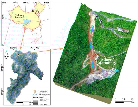 The Yongsheng landslide is located in Yongsheng Township, Sichuan Province, at geographical coordinates of 103°2′25.75′′E and 29°25′0.6′′N. This area has abundant water systems and an elevation above 2000 m a.s.l., with the overall terrain trending higher in the southwest and lower in the northeast. The maximum elevation is 3347 m, and the minimum elevation is 485 m (Figure 1).