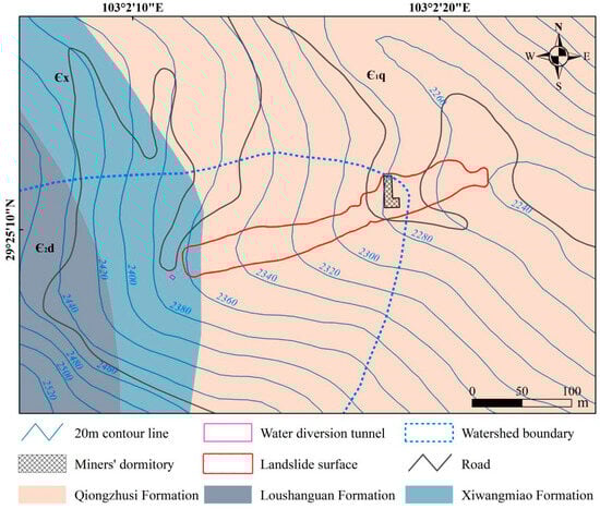 The landslide area is situated in the transitional zone between the eastern edge of the Qinghai–Tibet Plateau and the Sichuan Basin, characterized by complex geological structures including folds, faults, and fracture zones. Crustal uplift and river erosion have resulted in the formation of steep terrain, significantly impacting landslide activity. The stratigraphy of the gully catchment area where the Yongsheng landslide is located can be divided into two sections: the upper section is part of the Middle Cambrian Louzhanguan Formation (Є2d), while the lower section consists of the Lower Cambrian Xiwangmiao Formation (Єx) and Qiongzhusi Formation (Є1q) (Figure 2). Among these, the water diversion tunnel located on the right side of the landslide’s rear edge is within the Xiwangmiao Formation. This tunnel extends to a depth of approximately 57 m, and the lithology at the tunnel entrance is dolomite. The strata of the Xiwangmiao and Qiongzhusi Formations have a dip direction of 110°–120° and a dip angle of 10°–30°. The rock mass features well-developed fractures that divide it into blocks, resulting in fragmentation. According to field investigations, the main material of the landslide body is Quaternary Holocene residual slope deposits (Q4el+dl), primarily composed of gravelly silty clay.