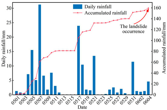 The region where the Yongsheng landslide occurred is characterized by a subtropical monsoon climate featuring mild temperatures, abundant rainfall, and significant freeze-thaw action. Figure 3 depicts the daily and cumulative rainfall in Leshan City. The figure shows that the area experienced continuous heavy rainfall in the month preceding the landslide, with the highest daily rainfall reaching 31.23 mm and the cumulative rainfall totaling 159.75 mm.
