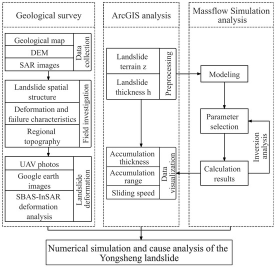 Figure 4 presents the flowchart of this study, including the following steps: (1) Field investigations were conducted, and the surface elevation before and after the landslide was extracted using DEM. Geological profiles were drawn, and the basic characteristics of the landslide were analyzed. Subsequently, the causes of the landslide were discussed based on surface InSAR deformation analysis results, regional topography, rainfall, and human engineering activities in the landslide area; (2) The Yongsheng landslide movement process was simulated using Massflow numerical simulations and the simulation results were imported into ArcGIS 10.8 software for data visualization and analysis; (3) Geological investigation, ArcGIS analysis, and Massflow numerical simulation were combined to analyze the kinematic process of the landslide.