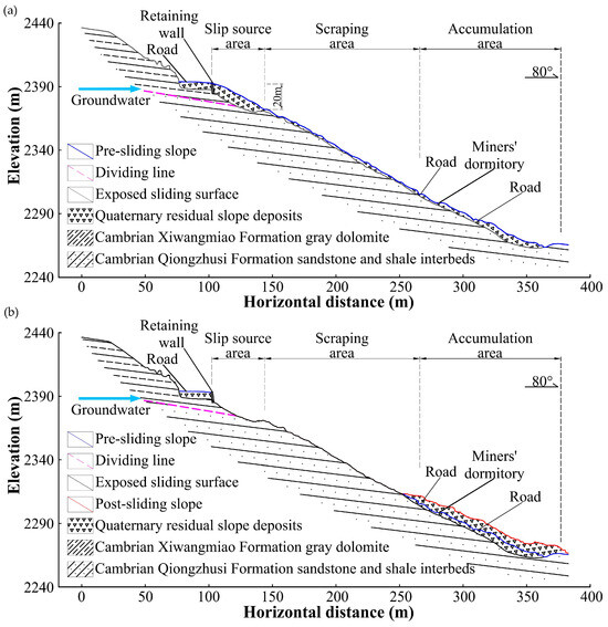 Geological profile A-A’: (a) Pre-landslide profile, and (b) post-landslide profile.