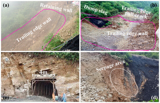 Characterization of the trailing edge of the landslide: (a) Overview of the trailing edge of the landslide; (b) exposed sliding surface; (c) water diversion tunnel on the right side of the rear edge; and (d) seepage area on the trailing edge wall.