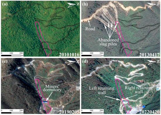 In the observation on 16 October 2010, no evident engineering activity was detected in the landslide area. The vegetation coverage of the gully watershed was approximately 92%, predominantly consisting of trees and shrubs (as shown in Figure 8a). By 17 April 2013, newly constructed roads were observed in the landslide area, with slope cuts during road construction altering the original landform. Simultaneously, abandoned slag was piled up in the catchment area within the gully at the top of the landslide area, and the image showed several long strips of white abandoned slag piles (as shown in Figure 8b). The observation on 5 February 2019 revealed evident human engineering activities in the landslide area, with accumulations in the slip source area and noticeable changes in the terrain height and slope within the gully. Additionally, a miners’ dormitory had been constructed at the bottom of the gully (as shown in Figure 8c). On 20 April 2022, two concrete retaining walls were constructed on the inner side of the road at the bottom of the gully, thereby widening the road foundation (as shown in Figure 8d). Compared to the observation image from 5 February 2019, no significant changes were detected in this area.