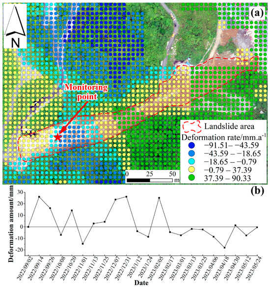 Landslide radar satellite imagery time-series differential results: (a) Time-series difference map of surface displacement satellite data; and (b) deformation curve of the monitoring point.