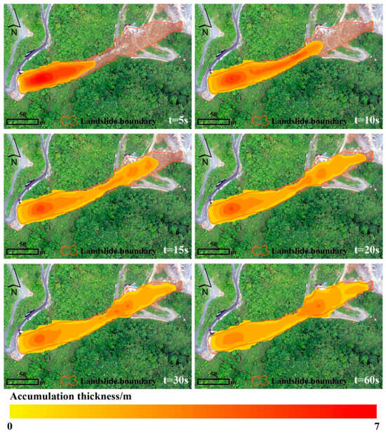 Within 0–5 s, the debris at the rear edge of the landslide rapidly moved towards the front edge due to gravity, sliding 139 m, with a peak accumulation thickness of 6.4 m. Within 5–15 s, the accumulation thickness began to gradually decrease, with a large amount of debris at the rear edge still poised to slide, and the landslide slid to 249 m. Within 15–60 s, the thickness of the accumulation area stabilized, reaching its maximum extent at 60 s. The thickness at the rear edge of the landslide reached its minimum, while the front edge thickness remained almost unchanged, indicating that the overall movement of the landslide had ceased. The accumulation state at this point represents the final accumulation state.
