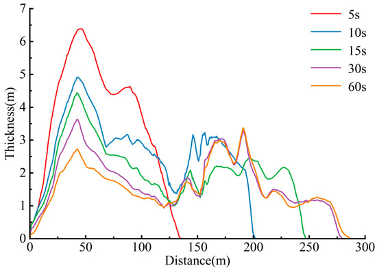 The thickness of the accumulation body was extracted at five different times along section A-A’ (Figure 5g) to obtain the landslide accumulation thickness at different intervals, as shown in Figure 11.