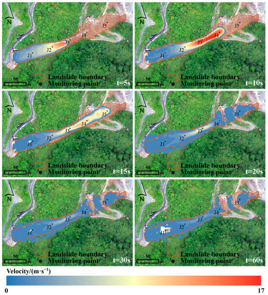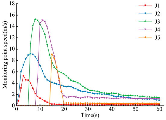 To further study the sliding characteristics of landslides at different stages, this study established monitoring points to observe changes in speed (Figure 13). J1 is located at the rear edge of the landslide, with a peak speed of 5.3 m/s. This area’s sliding body has high potential energy, and when passing through this point, the sliding body is still in the acceleration phase. J2 is located in the middle of the gully, where the speed is characterized by low acceleration and high velocity, reaching its peak speed at t = 6 s. The peak speed of J3 slightly lags behind those of the first two monitoring points, reaching 15.3 m/s at t = 8 s. J4 is located near the miners’ dormitory. The landslide impacts this area at a speed of 7.9 m/s at t = 9 s, and the speed continues to increase, reaching a peak speed of 15.1 m/s. After passing this point, the speed significantly decreases due to obstruction. J5 is located at the front edge of the landslide. After passing J4, the energy of the landslide decreases, resulting in a reduction in velocity.