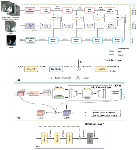 Overview of the proposed SD-GeoSTUNet. Hereinafter referred to as CNN branch and Swin-T branch, respectively. (a) Overview of Decoder Layer. (b) Overview of Feature Aggregation Module (FAM). (c) Overview of Residual Layer.
