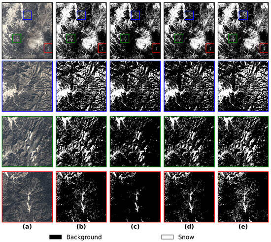 Detection results of snow in mountain regions under different geographic information feature combination ablation experiments, and enlarged views marked with blue, green, and red boxes. (a) RGB true color image. (b) Label. (c) Experiment 1 detection results. (d) Experiment 2 detection results. (e) Experiment 3 detection results. In (b–e), black and white pixels represent the background and snow, respectively. The scene is at the center of 128.9°E, 44.7°N, and the date is 27 January 2018.