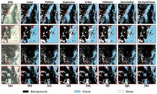 Except for the background, the detection results of clouds and snow coexistence and the enlarged views (marked with the red box in the figure). (a) RGB true color image. (b) Label. (c) PSPNet. (d) Segformer. (e) U-Net. (f) CDNetV2. (g) GeoInfoNet. (h) SD-GeoSTUNet. In (b–h), black, blue, and white pixels represent the background, cloud, and snow, respectively. The scene of the first row is at the center of 104.2°E, 31.3°N, and the date is 29 March 2018. The scene of the third row is at the center of 104.6°E, 33.0°N, and the date is 29 March 2018.