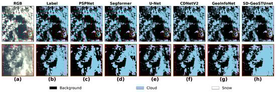 Due to the extremely high spectral, texture, and shape similarity of cloud and snow, its accurate segmentation has always been a challenge []. In the results displayed in Figure 6, SD-GeoSTUNet shows evident superiority to other models in cloud and snow boundary discrimination, which is the most consistent with the label. PSPNet and Segformer exhibit worse extraction of detailed contours for cloud and snow targets, as well as the differentiation between cloud and snow boundaries. Meanwhile, U-Net, CDNetV2, and GeoInfoNet have different degrees of cloud and snow misjudgment, resulting in blurred boundary distinction.