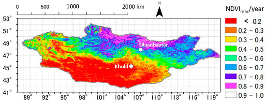 Spatial distribution of yearly maximum NDVI (NDVImax) in Mongolia in 2020 with a resolution of 0.05° latitude × 0.05° longitude. The distribution was calculated from the daily MODIS data product MOD-09CMG, which was downloaded from the Land Processes Distributed Active Archive Center (https://lpdaac.usgs.gov/).