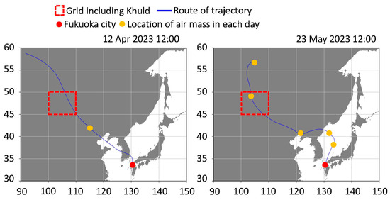 Backward trajectories ending at 500 m altitude above Fukuoka City obtained by METEX on 12 April and 23 May 2023. Red dashed squares indicate the grid including Khuld. Red and orange dots show the locations of Fukuoka City and the location of each day, respectively.