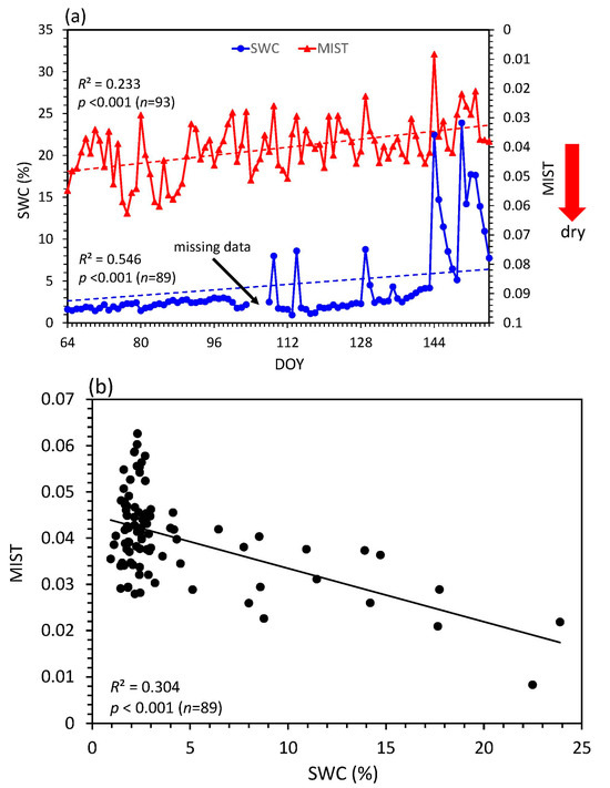 Figure 7a shows the daily values of SWC and MIST. Both significantly increased (p < 0.001) during the study period due to rainfall events that began in mid-April. MIST decreased as SWC increased and was significantly correlated with SWC (p < 0.001, Figure 7b). There was greater variability (0.043 ± 0.008) when SWC was less than 3% (i.e., when it was extremely dry). Since there may be a limit of the measurement accuracy (±1 to 2%) in the SWC sensor itself, it is difficult to determine the causes of variability in MIST values.