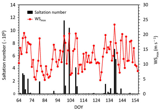 Figure 8 shows the daily values of the saltation number at 35 cm and the maximum wind speed WSmax at 10 m (by Equation (4)). The saltation number at 35 cm was used because the number of observations exceeded the maximum that could be recorded by the data logger (2,147,483,647) during heavy sandstorm events at other heights (8 cm and 11 cm).