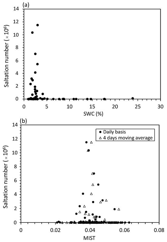 Figure 9b shows the relationship between MIST and saltation number. Of the 16 blown sand events, 10 occurred when MIST exceeded 0.039 (which corresponds to SWC = 5%, Figure 7b). The accuracy rate of using MIST to detect blown sand events was 63%; this value is relatively low, most likely because MIST values varied when SWC was less than 3% (Section 3.2). However, the accuracy rate increased to 81% (13 of 16 events) when the 4-day moving average of MIST was used (Figure 9b).