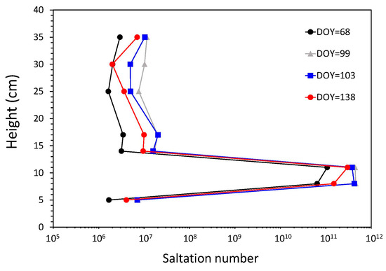 Although the number of observations at 8 cm and 11 cm exceeded the maximum recorded number by the data logger (2,147,483,647) during blown sand events, the vertical profile of the daily saltation number when the sandstorm occurred is shown as an example (DOY = 68, 99, 103, and 138) (Figure 10). The saltation numbers were the largest at 8 cm and 11 cm and almost the same at other heights. The vertical profile of the saltation number was very close to the results in mass flux having their peak around 10 cm over transverse dunes by wind tunnel experiment and numerical simulations [50]. The results indicated that the windward slope gradient played a great role in the lift-off and sand particle saltation. In fact, our station was not a flat surface, as shown in Figure 2 and Figure 6. Regardless, the problem of recorded number by the data logger should be improved to monitor the accurate vertical profile of the saltation number.