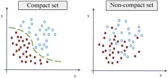 Ships navigating in the ocean inevitably emit sound waves. These emitted underwater signals typically contain discriminative characteristics that are critical for classifying different ships, such as the ship structure, propeller configuration, engine power, and ship condition. Common UATR tasks include vessel type classification [1,2,3], sonar imagery recognition [4,5,6,7,8], and recognition of communication signal modulation [9,10]. As an important branch of ocean remote sensing, underwater acoustic target recognition (UATR) technology has a wide range of marine applications, including marine resource development, ocean rescue, biological protection, and military applications. Its main purpose is to process and analyze sonar-received signals in order to determine the target type based on discriminative characteristics. From the perspective of pattern recognition, the task of UATR fundamentally addresses the challenge of enhancing separability among different types of ships, that is, how to pull homologous samples closer and push heterologous samples apart to construct a compact set. As shown in Figure 1, it is always possible to find separable boundaries between different ship classes for compact sets, whereas for noncompact sets, it is difficult to find an obvious separable boundary.