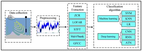 Figure 3 illustrates the workflow of a typical intelligent UATR system, including data collection, data preprocessing, feature extraction, and classification algorithms. Among these processes, data collection is conducted by sonar operators using hydrophone arrays to acquire acoustic data. Subsequently, data preprocessing is implemented to mitigate clutter interference and to eliminate the effects of Doppler shift [13,14,15]. Typical preprocessing techniques include resampling, filtering, and denoising, which contribute to obtain high-quality signal data. Importantly, the process of feature extraction and the design of classification algorithms are considered to be crucial aspects that affect the recognition performance.