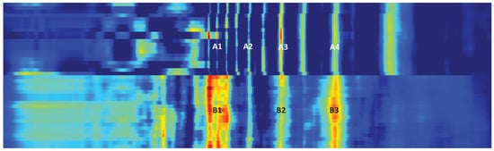 An example of a fused LOFAR and DEMON spectrogram with comb filtering [31]. A1–A4 and B1–B3 represent the primary spectral lines.