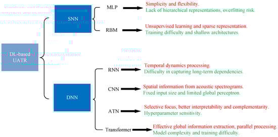 For classification algorithms, machine learning (ML) methods were firstly introduced into the field of intelligent UATR, such as support vector machine (SVM), K nearest neighbor algorithm (KNN), hidden Markov model (HMM), and logistic regression (LR). Due to the relatively simple structure of ML models, these methods primarily utilize shallow signal features for intelligent recognition of simple targets, such as whale calls [16] and medium echoes [17]. As a subset of ML, deep learning (DL) methods are capable of learning deep representations from complex acoustic signals using deep neural network (DNNs). Composed of stacked layers, DNNs are particularly effective in automatically extracting hierarchical features from acoustic data. Recent research has extensively investigated DL-based UATR methods, demonstrating their superiority over shallow ML classifiers by leveraging high-level information inherent in acoustic signals [18,19]. Initially, early DL-based intelligent UATR systems were constrained by computational resources, particularly limited GPU memory, which made it difficult to perform fast and stable DNN training. However, in the early 21st century, significant advancements in electronic technology were made, notably enhanced computational capabilities of GPUs. Consequently, the application of advanced DL techniques has made significant progress in intelligent UATR, thereby making substantial contributions to the field of ocean remote sensing.