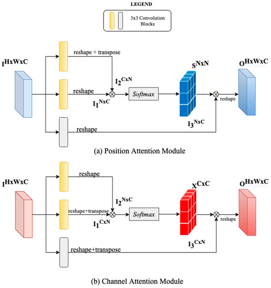 This work utilizes a self-attention framework that draws inspiration from the dual-attention network proposed in [36]. The utilization of two synchronous attention modules, namely the position-attention module and the channel-attention module, has been implemented to efficiently capture the interconnectedness of features in both spatial and channel dimensions. This structure facilitates the mutual enhancement of any two positions with similar characteristics, whether they are within the same channel or across several channels, in response to a certain trait. The multiresolution framework captures local as well as global contextual information due to the nature of the decomposed sub-bands of the input image. The attention modules streamline the extracted features by prioritizing elements that are essential for enhancing the segmentation performance due to their weighting scheme. The attention module can be understood as a process that both removes noise and improves the quality of the feature space by transforming it into a domain where spatial and channel features are not uniformly weighted. Furthermore, because to the reduction in receptive fields in conventional fully linked networks to a local scale, they lack the ability to represent intricate long-range contextual information derived from a diverse combination of local and global properties. The dual-attention technique effectively addresses the aforementioned issues by utilizing location and channel-attention modules. Figure 3 provides a comprehensive diagram of the arrangement of location and channel-attention modules, showcasing various matrix linkages.