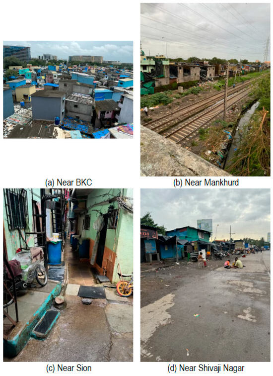 Sample informal settlement areas depicting variability in structures: (a) informal settlements around tall buildings near BKC area; (b) informal settlements along railway line near Mankhurd area; (c) informal settlements near Sion showing inner pockets; (d) informal settlements near main road in Shivaji Nagar area.