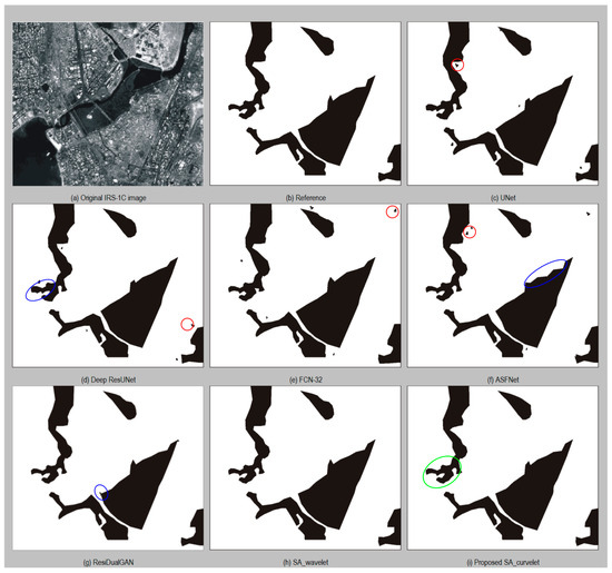 To further assess the results, a visual comparison for qualitative analysis is carried out. In the visual comparison between the input images, ground-truth reference masks, and segmented outcomes, it is observed that, in general, the slum representations in the outcomes using the proposed method are a clear improvement over the other models. In Figure 5 and Figure 6, the misclassified portions are marked with red circles, areas encircled in blue show irregular boundaries in the result, and areas encircled in green show proper regular boundary detection in the result. The wavelet-based approach and other models are found to be unsuitable in terms of the orientation and anisotropic properties of the classes, as illustrated in Figure 5d,f,g and Figure 6c,e,f,h; however, curvelet features efficiently captured the curved edges, as shown in Figure 5i and Figure 6i. The slum areas do not appear to be intermixed with partially built-up areas and other classes, as observed while using other models. The accuracy in the boundary shape and edge continuity is observed to be better especially in the middle-left portion in Figure 5. Similarly, a deviation from the reference mask (Figure 6b) boundaries can be observed in the bottom-right part of the image (Figure 6c–h).