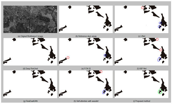 Slum area identification results using the Worldviw-2 image covering Cheeta Camp and nearby areas: areas encircled in red show misclassified areas, areas encircled in blue show irregular boundaries in the result, and areas encircled in green show proper regular boundary detection in the result. (a) Original image covering Dharavi and nearby areas; (b) reference showing slum areas; (c) slums identified using UNet [39]; (d) slums identified using ResUNet [40]; (e) slums identified using FCN-32 [41]; (f) slums identified using ASFNet [44]; (g) slums identified using ResiDualGAN [48]; (h) slums identified using self-attention and wavelet-based MRA; (i) slums identified using the proposed method of self-attention and curvelet-based MRA.