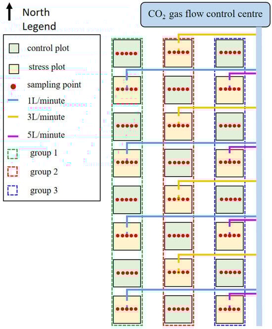 CO2 was injected into the experimental plot, and copper pipes were used for gas transportation, as shown in Figure 2. The PVC pipe was inserted into the center of the plot at a 30° angle from the northern edge to the vertical direction, reaching a depth of approximately 60 cm. At the pipeline’s end, 8 small holes were evenly created in various directions to ensure minimal gas leakage, with the CO2 concentration at each leakage point in different directions being essentially the same. The holes were sealed with gauze to prevent soil blockage. The gas flow rate was remotely regulated by a Programmable Logic Controller (PLC), maintaining gas leakage rates of 1 L/minute, 3 L/minute, and 5 L/minute. Following the ventilation initiation, gas leakage was sustained for 24 h until the experiment’s completion. Wheat was uniformly sown in the plots, and CO2 was injected into the experimental plots when vegetation growth was relatively stable. Throughout the experiment, both the control group and the experimental group underwent identical treatments to ensure normal plant growth conditions, with the only difference being the injection of CO2 into the experimental group’s plots.