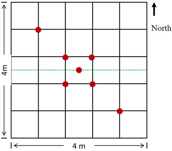 The gas concentration in the soil of the experimental plots was measured using a GXH-3050E portable infrared gas analyzer produced by Beijing Tongde Venture Technology Co. (Beijing, China). Seven gas concentration sampling points were laid out in the experimental plot, and the sampling points were set up as shown in Figure 3. One hollow PVC pipe was inserted at each point, and the bottom end of each pipe was inserted into the soil at a depth of 30 cm from the surface, respectively. The top of the pipe was plugged with a rubber stopper to prevent gas diffusion from affecting the measurement of gas concentration. The rubber stopper was pulled out for observation and direct connection to the instrument during the measurement, and when the gas diffusion in the soil reached a stable state, the CO2 concentration value at the point was measured at this time. Gas concentration data can be used to assist in verifying CO2 leakage.